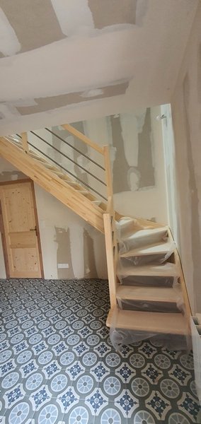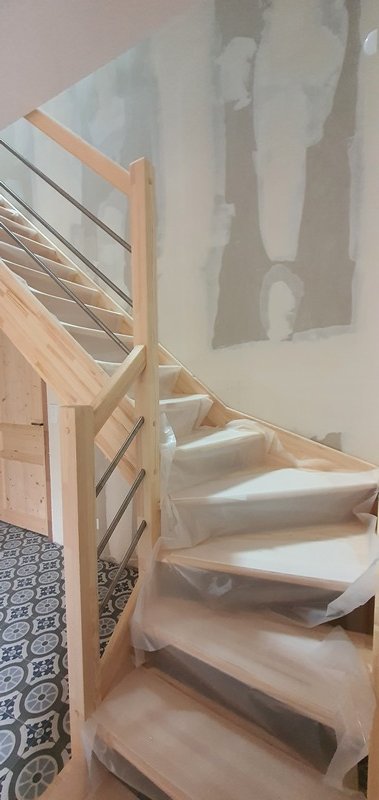 • Finitions soignées et protection du chantier : chaque marche est protégée durant les travaux afin de préserver l’aspect final du bois.